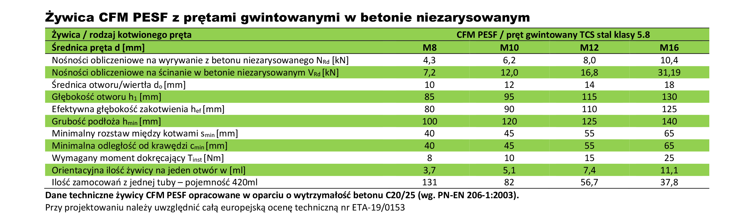 - wklejanie prętów gwintowanych w betonie, betonie zbrojonym, kamieniu naturalnym i podłożach murowych