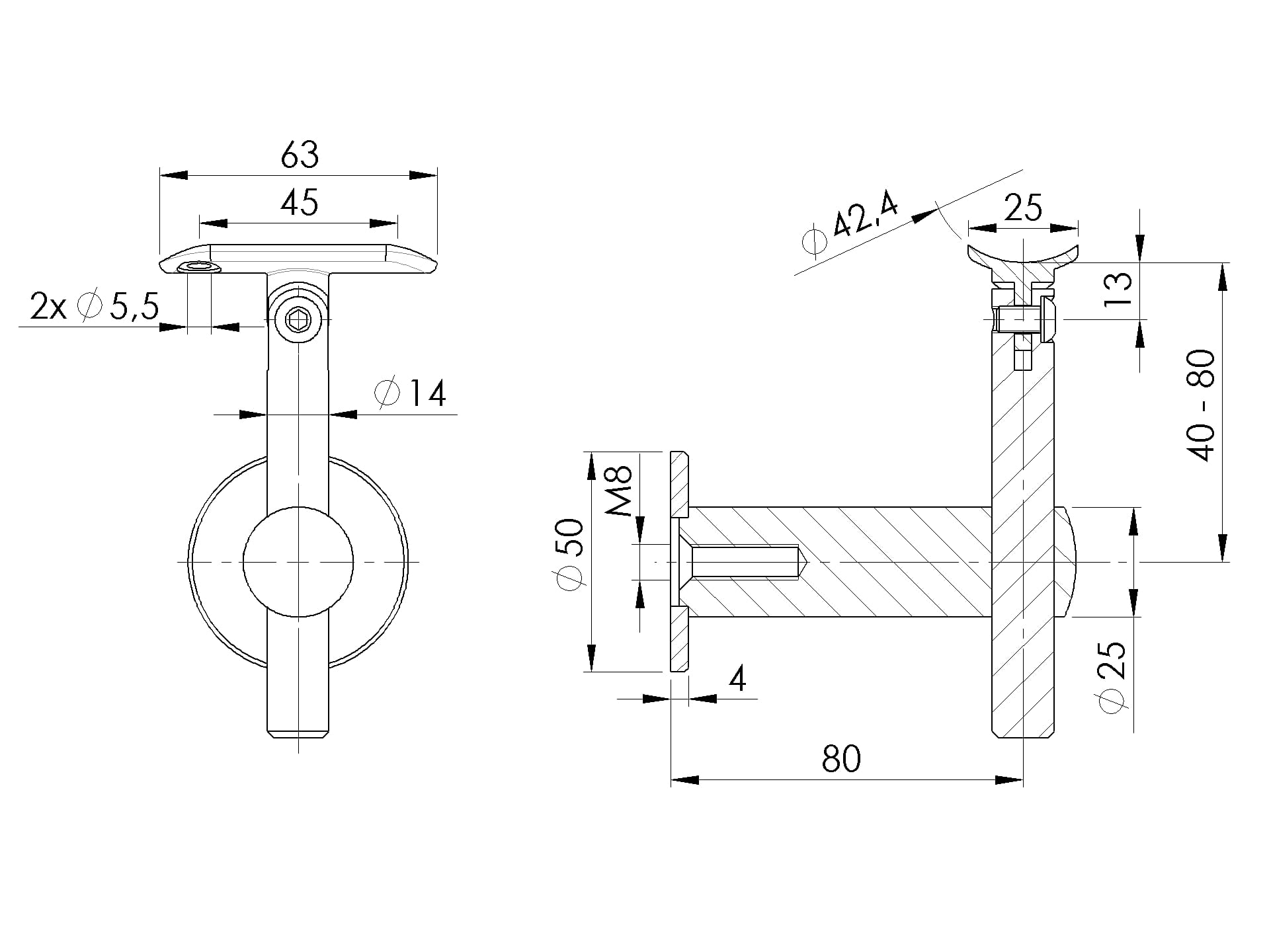 Mocowanie poręczy do boku słupka 42,4mm pochwyt płaski (szlif) AISI 304
