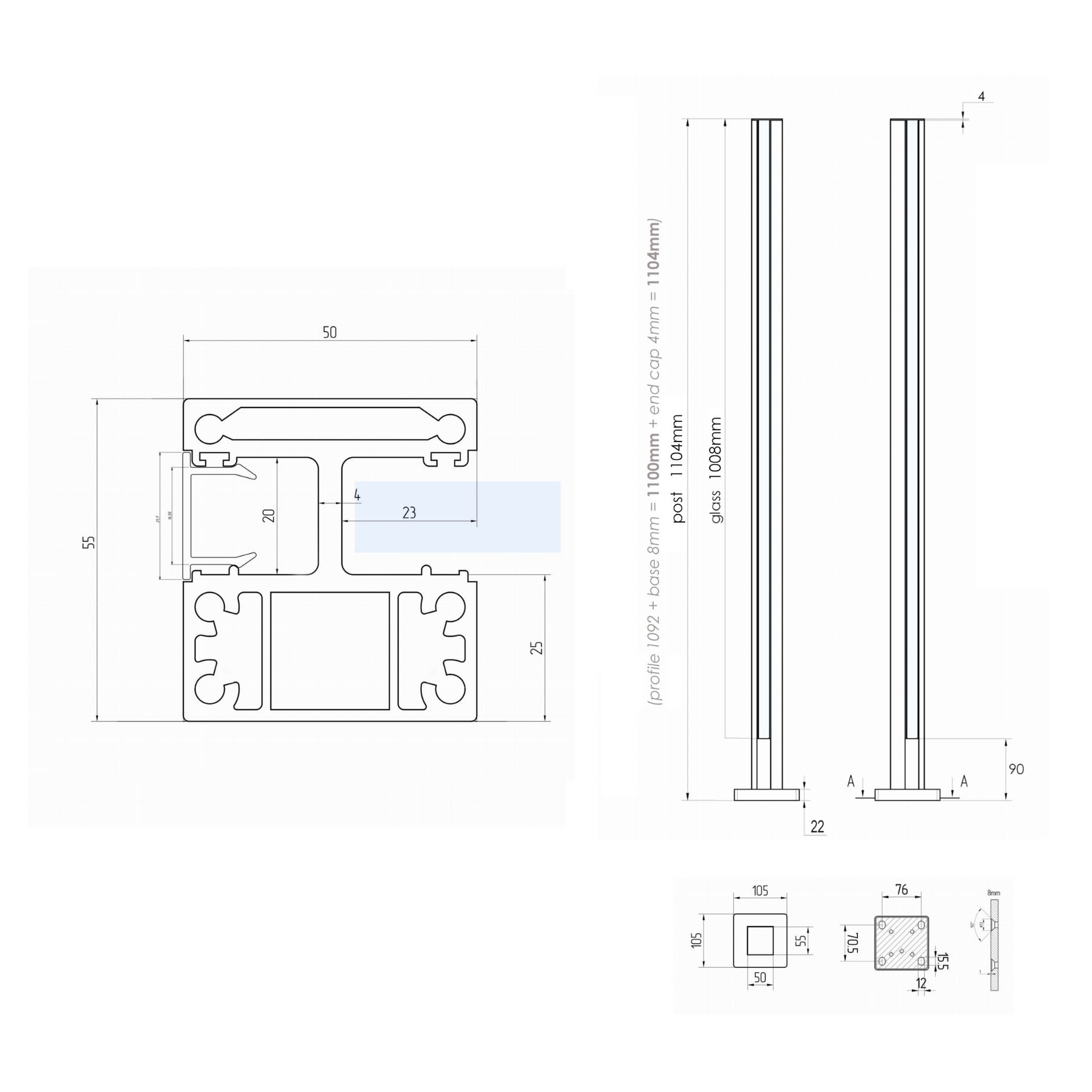 - Słupek (profil + podstawa (gr. 8mm) skręcone ze sobą) + zaślepka górna (gr. 2mm)