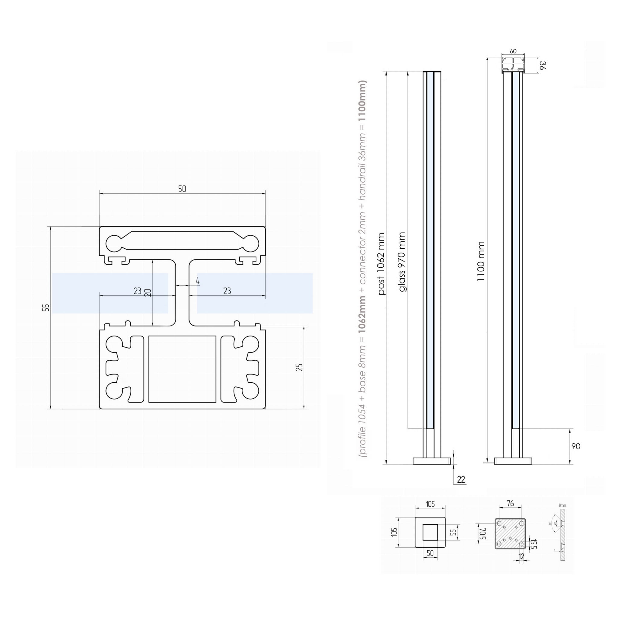 - Słupek (profil + podstawa (gr. 8mm) skręcone ze sobą) + blacha górna gr. 2mm (łącznik poręczy ze słupkiem)