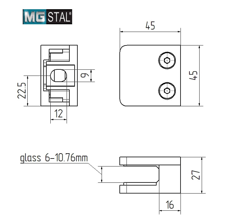 Uchwyt do szkła 45x45 do pow. płaskiej (poler) AISI 304
